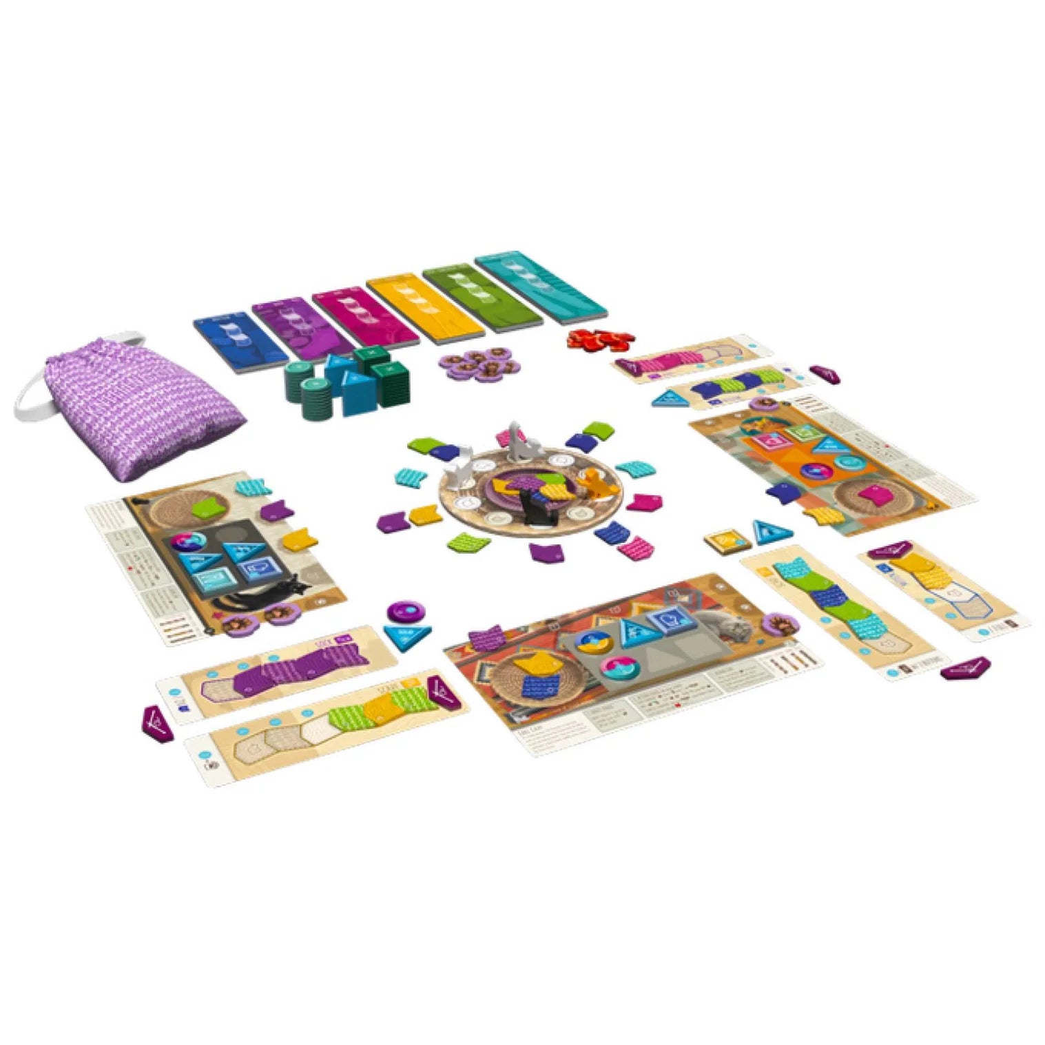 Knitting Circle is a beautiful strategy board game for 1-4 players that plays in 30-45 minutes. From the team that brought you Calico, Cascadia, Verdant, Fit to Print, and Nocturne, this cozy game designed by Emily Vincent and developed by the Flatout Games CoLab is a delightfully interactive puzzle with quick drafting, simultaneous play, and satisfying combos. Take on the role of a knitter sitting around the knitting circle with your feline friend, and compete to create the coziest, most beautiful assortment of garments to win the game!