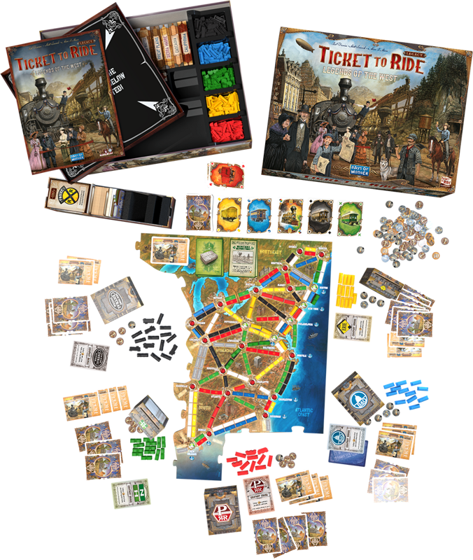 Ticket to Ride® Legacy: Legends of the West finally gives you the chance to step into the story of your favorite train game and explore the imagination of Rob Daviau, Matt Leacock and Alan R. Moon. You will embark on a journey across twelve games, managing your own North American railway company to wealth and fortune in a campaign full of adventures.